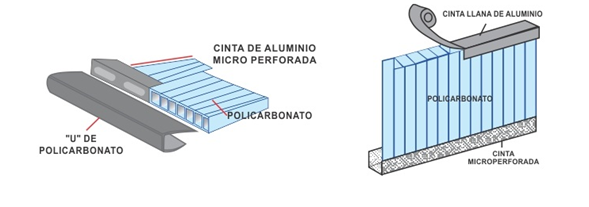 Para unir planchas de policarbonato se utilizan los conectores (Perfiles H). Estos solamente se deben de utilizar por el lado longitudinal de la lámina, si va unir por el lado transversal de la plancha (alveolos expuestos) se debe traslapar.