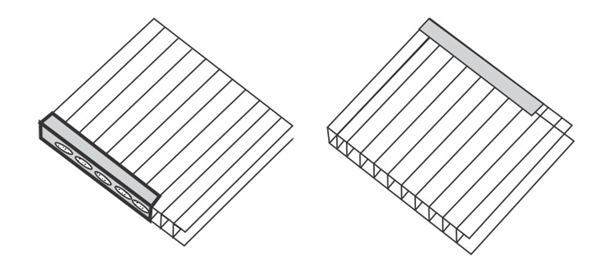 1. Se cortan las planchas de acuerdo al diseño de la estructura, cuidando que las uniones entre planchas se ubiquen sobre la estructura de soporte. Se retiran los films protectores de las planchas, luego se encintan los alveolos con los perfiles U. Entre la plancha y la estructura para un mejor sellado se puede usar cintas de butil o de doble contacto.
