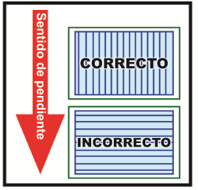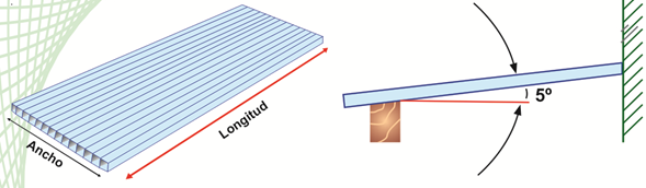 1. Instalar la plancha de tal manera que los alveolos queden inclinados con una pendiente mínima. Cuando el alveolo tiene pendiente el agua que se forme por la condensación va a poder fluir por gravedad y salir de los alveolos interiores. NUNCA INSTALE LA PLANCHA DEJANDO LOS ALVEOLOS EN FORMA HORIZONTAL.