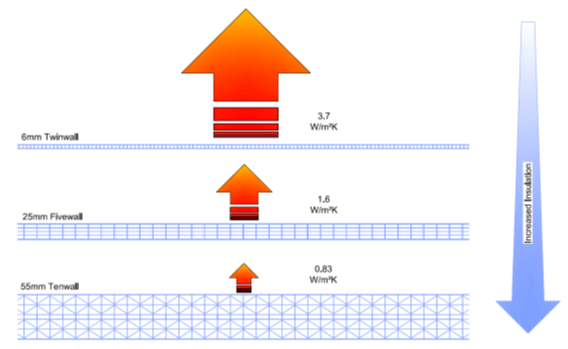 Una de las ventajas más notables del policarbonato alveolar Marlon ST Longlife de Brett Martin, especialmente en las regiones más frías, es que resulta mucho más eficiente a la hora de prevenir una excesiva pérdida de calor que los materiales traslúcidos tradicionales de espesor similar.