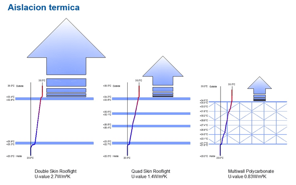 La luz del sol contiene radiación inflarroja (calor) que para ingresar a su ambiente interior va a encontrar una barrera en la plancha de policarbonato. En el caso de la plancha de triple alveolo (cuatro paredes) va a encontrar tres barreras pequeñas (1), (2) y (3) en cambio con la plancha de alveolo simple (doble pared) va a encontrar una sola barrera. Por esta razón el valor U de una plancha de 8 mm. triple alveolo (cuatro paredes) es 2.8 W/m2 K en comparación al valor U de 3.4 W/ m2 K de la lámina de un solo alveolo (doble pared). Para la plancha de 10 mm. los valores son 2.5 W/m2 K y 3.2 W/M2 K respectivamente. (Cuando más bajo sea el valor U, mejor comportamiento térmico tendrá el material)