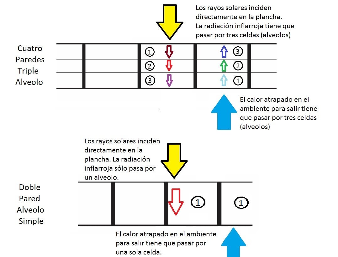 En el mercado se pueden encontrar láminas de alveolo simple (doble pared) o triple alveolo (cuatro paredes). Ambas pesarán lo mismo 8 mm. (1.5 Kg/m2) o 10 mm. (1.7 Kg/m2) pero la diferencia más notable la encontrará en sus propiedades térmicas. Según el siguiente esquema: