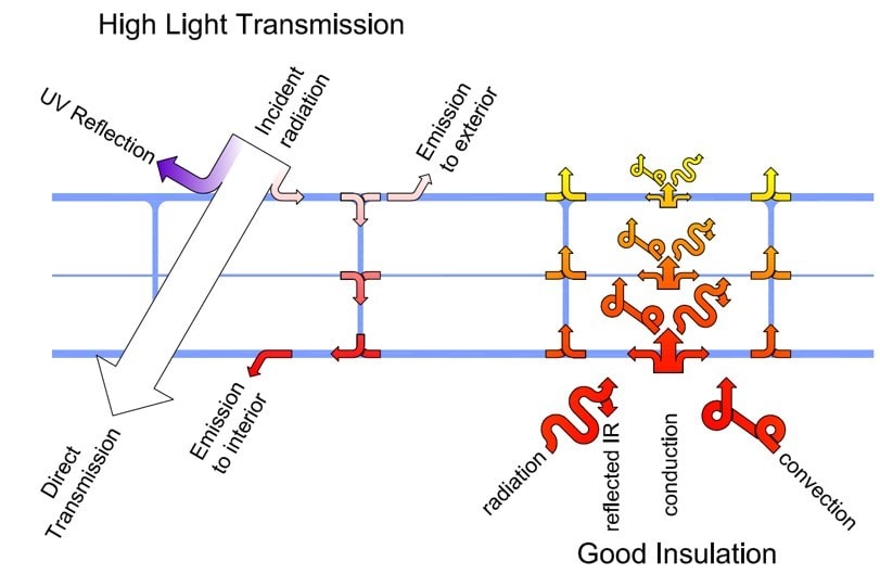La lámina de policarbonato es transparente para longitudes de onda de luz entre 385 nm de límite inferior y aproximadamente 5.000 nm de límite superior. Un rasgo importante del policarbonato es que resulta opaco a la radiación infrarroja: la luz del espectro visible que entra en un edificio es absorbida por el interior y el contenido, y vuelve a irradiarse en forma de radiación infrarroja de onda larga, que no puede volver a difundirse hacia atrás a través de la lámina de policarbonato.