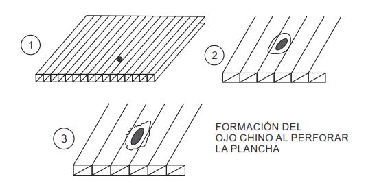 Es altamente recomendable no perforar directamente las placas de policarbonato con fijaciones porque al ser el policarbonato un cuerpo con alta dilatación da lugar a que se formen “ojos chinos” que son ingresos de agua y suciedad que mancha interiormente la plancha. En caso no haya otra alternativa para fijar la plancha, las arandelas tipo botón son una alternativa porque por su tamaño y su sellante interior permite proteger los “ojos chinos” que se forman con la dilatación de la intemperie. Se compone de: arandela con su tapa, el anillo sellante interior y un perno autoperforante de 2”.