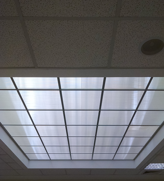 Lámina de policarbonato traslúcida a instalarse en los cielos rasos suspendidos (suspensión 15/16") diseño Cracked Ice. Permite el paso de la luz natural o fuentes de luz artificial. Medida: 1.22 m. x 0.61 m. Espesor: 2 m..