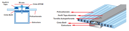 Perfil H de aluminio , permite unir dos planchas de policarbonato usando la estructura como base. Se instala sobre la intersección de dos planchas de policarbonato que coinciden sobre la estructura del techo. Viene provisto de dos tiras de gomas negras de EPDM que garantizan un máximo sellado contra el viento y la humedad. Se fijan con pernos autoperforantes de 1.1/2” cada 40 cm. Se puede curvar